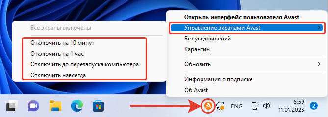 Как и любой антивирусный продукт, Avast можно выключить временно или остановить навсегда (пока не включите вручную). Оба варианта отключения выполняются либо через контекстное меню иконки запуска программы в трее Виндовс, либо через главное окно антивирусника.