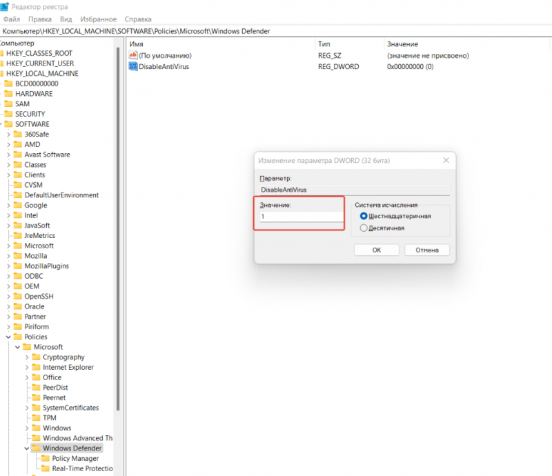Как отключить антивирус Виндовс 11 с помощью реестра