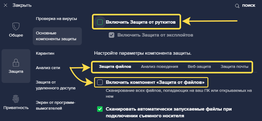 - Перейдите к «Компоненты защиты» и отключите требуемые объекты.