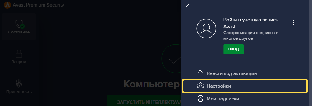Открытие настроек антивируса Avast