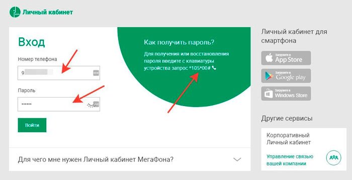 логин, которым служит номер мобильного, и пароль. Для его получения