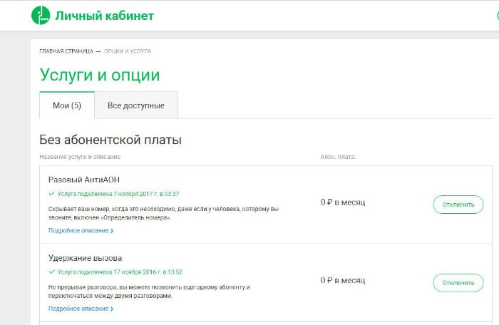 С помощью ЛК можно управлять параметрами тарифного плана, подключать и отключать опции, контролировать трафик и счет, заказывать детализацию и многое другое. Все подсписки платные и бесплатные вы найдете в разделе “Услуг”. Через интернет можно отключать опции, если ваша симка используется на модеме. К таким тарифам часто подключают ненужные подписки.