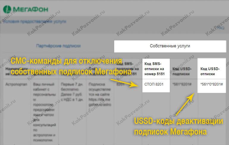 Для собственных подписок Мегафона также указаны USSD-комбинации, активирующие или удаляющие мобильную подписку.