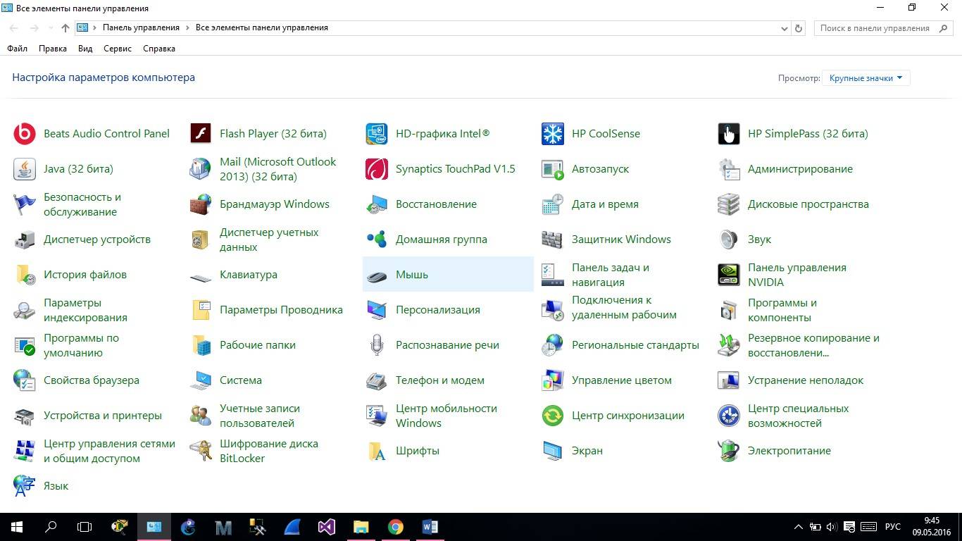 - Проверяете, чтобы в разделе «Вид» стояло «Значки», открываете подпункт «Мышь»;
