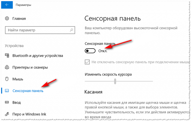 Параметры/Устройства/Сенсорная панель/переключить на Отключено