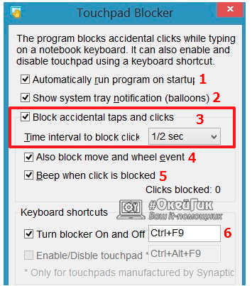 - Настройка «горячих клавиш» для активации и дезактивации программы Touchpad Blocker.