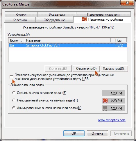 С помощью данного способа вы сможете отключить тачпад, не вникая в работу с драйверами. Большинство современных устройств работают со специальной сенсорной панелью Synaptics.