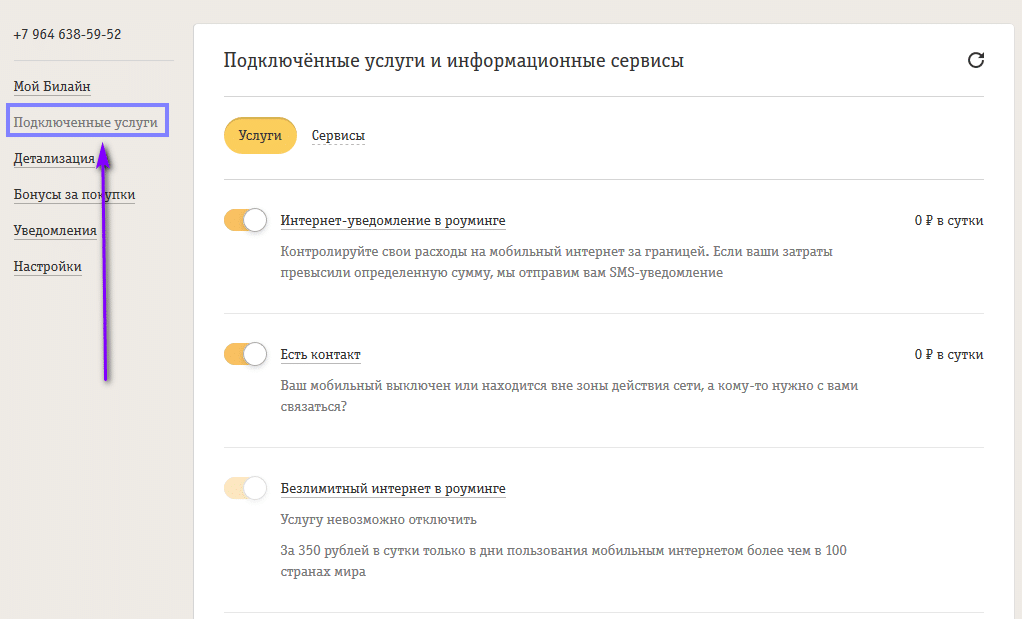 Сотовый оператор «Билайн» предусмотрел в личном кабинете возможность проверки наличия подключенного развлекательного контента. Информация содержится в разделе «Подключенные услуги» на вкладках «Услуги» и «Сервисы».