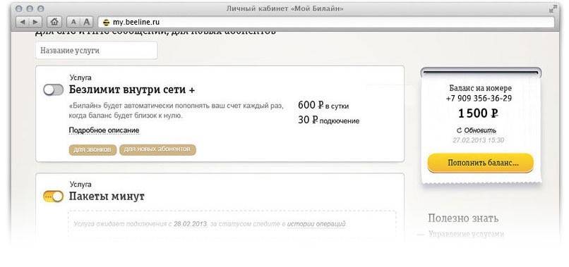 - Еще один способ избавления от ненужных подписок на «Билайне» – это отключение всего лишнего в личном кабинете. Для входа на свою приватную страницу можно воспользоваться этими координатами: my.beeline.ru.