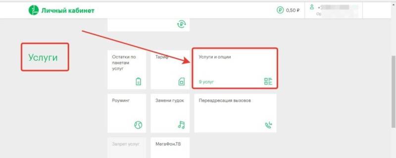 - После авторизации нужно найти на главной странице раздел «Услуги и опции», открыть его.