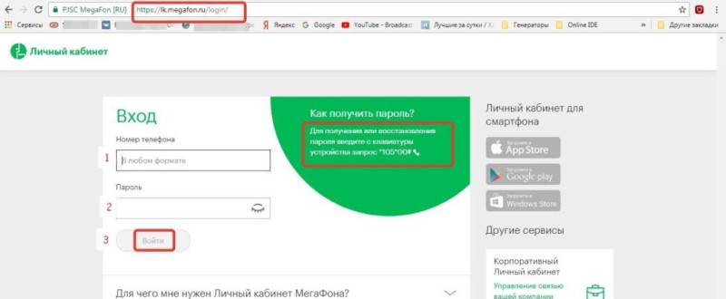 . Для начала необходимо посетить lk.megafon.ru. У каждого абонента Мегафон имеется личный кабинет, даже если он им ни разу не пользовался. Чтобы войти туда, необходимо получить пароль. Для этого набираем на мобильном ✶105✶00#