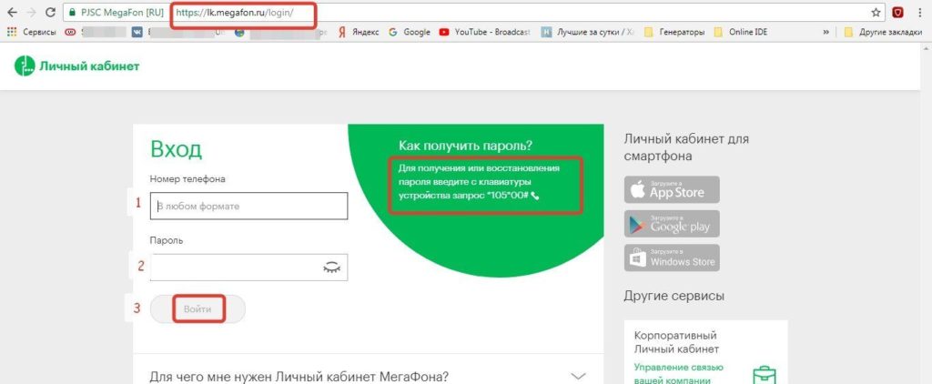 Удобная функция по выполнению данной задачи находится в Личном кабинете. Для начала необходимо посетить lk.megafon.ru. У каждого абонента Мегафон имеется личный кабинет, даже если он им ни разу не пользовался. Чтобы войти туда, необходимо получить пароль. Для этого набираем на мобильном ✶105✶00#. Логином служит ваш номер телефона. Более подробно о входе в Личный кабинет Мегафон можете прочитать здесь.
