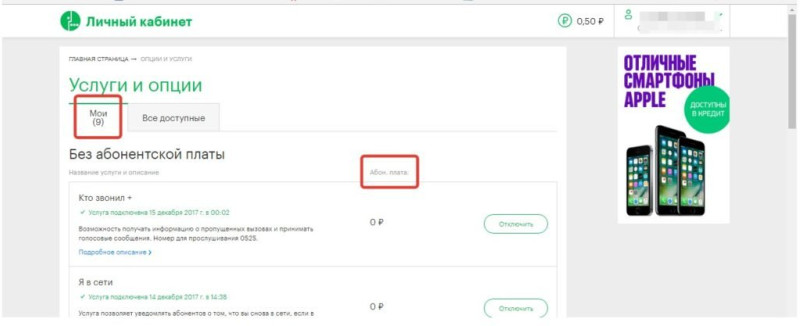 - Там будет подраздел «Подключенные услуги», где можно увидеть список активированных на данном номере опций. Снимайте галочки с ненужных, нажимайте кнопку «Отключить» для их полной деактивации.