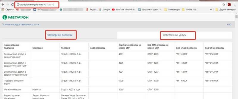 «Подводный камень» заключается в том, что кроме перечисленных в Личном кабинете сервисов, Мегафон также предоставляет возможность подписок. Управление ими происходит с отдельного сайта: moy-m-portal.ru.