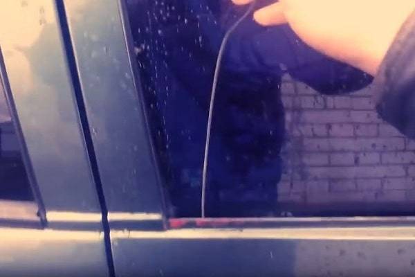 Чтобы открыть линейкой проволокой, необходимо отжать уплотнитель стекла. Цель – зацепить тросик, чтобы открыть замок двери. Для этого загибаем конец проволоки (10 сантиметров) и передвигаем инструмент в поисках препятствия, и когда линейка зацепится за тросик, тянем её вверх.