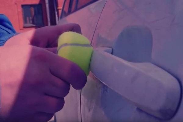 При наличии теннисного мячика можно попробовать ещё один сомнительный способ открыть замок. Сразу скажу, что он малоэффективный, но, тем не менее, пишут, что кому-то он помог. Как он работает? В мяче нужно проделать небольшое отверстие, и приложить его к замку, затем резко надавить, чтобы поток воздуха поднял блокировочный флажок.