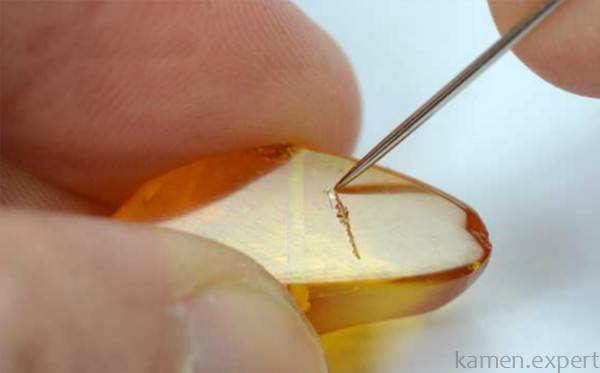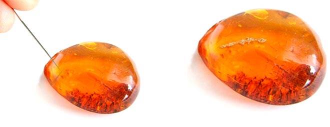 Нагреть тыльную сторону янтаря горячей иголкой или другим небольшим предметом из металла