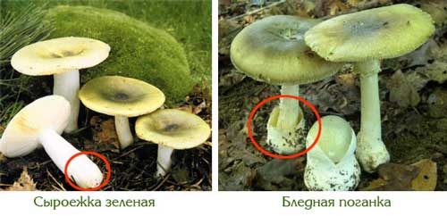 Молодые экземпляры бледной поганки и зеленой или зеленоватой сыроежки могут быть очень похожи. Однако и между ними существует ряд отличий: