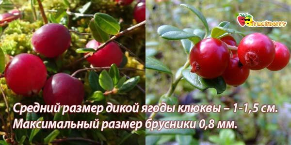 - Клюква крупнее. Нормальный размер дикой ягоды — 1 см в диаметре. Выращиваемые на плантациях плоды могут быть ещё больше и достигать размера в 1,6 см. У брусники нормальный размер их — 0,6-0,8 см в диаметре. Если есть возможность положить две эти ягоды рядом и сравнить их, эта разница явно бросается в глаза;