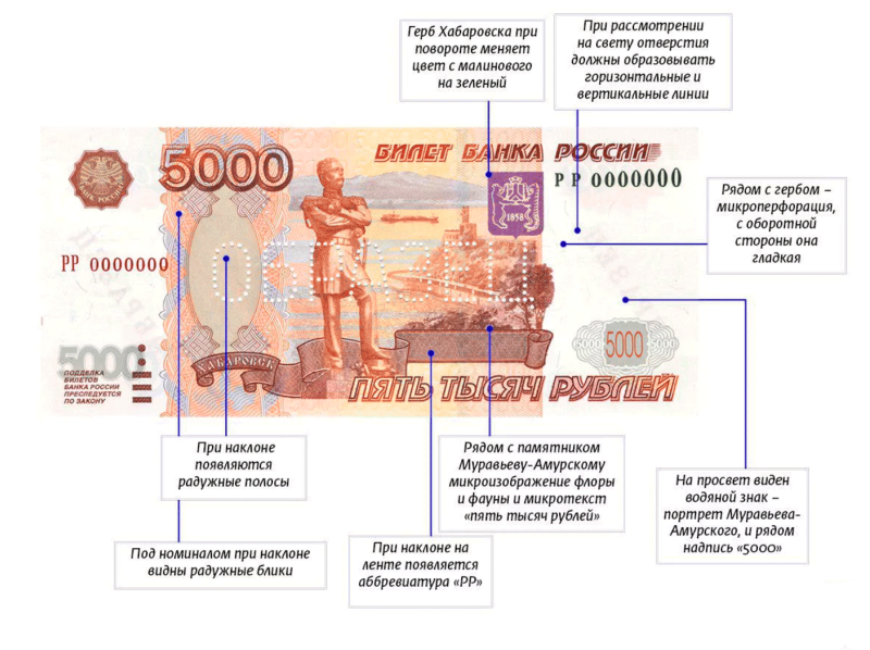 - Под углом. Эмблема герба Хабаровска должна переливаться разными красками, в центре купюры под углом можно разглядеть буквы «РР», а под самой крупной надписью «5000» можно увидеть разноцветные разводы.