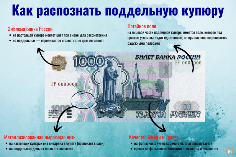 Как определить подлинность купюры номиналом в 1000 рублей