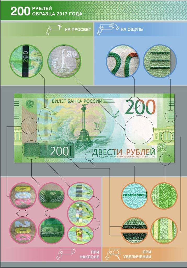 С левой стороны под гербом можно увидеть слово «Россия». При наклоне купюры виднеются цифры номинала. Каждая из них обладает своим оттенком. Также определить подлинность купюры можно на ощупь. При этом удастся почувствовать надписи «Двести рублей» и «Билет Банка России». По краям купюры представлены горизонтальные штрихи.