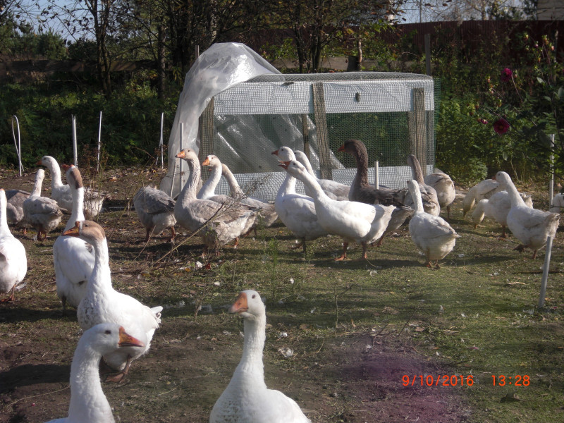 Для содержания племенных и откормочных гусей достаточны простые загоны с высотой ограждений 1,20—1,50 м, одна треть либо половина площади которых находится под навесом.