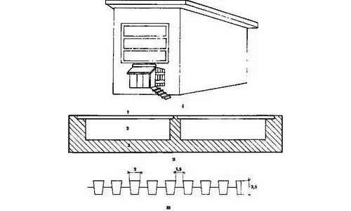II — пространство для помета: 1 — решетка, 2 — пометохранилище (глубина 20—25 м), 3 — бетонное основание,