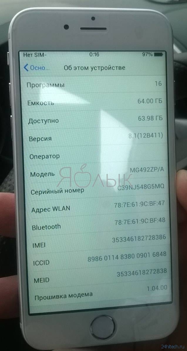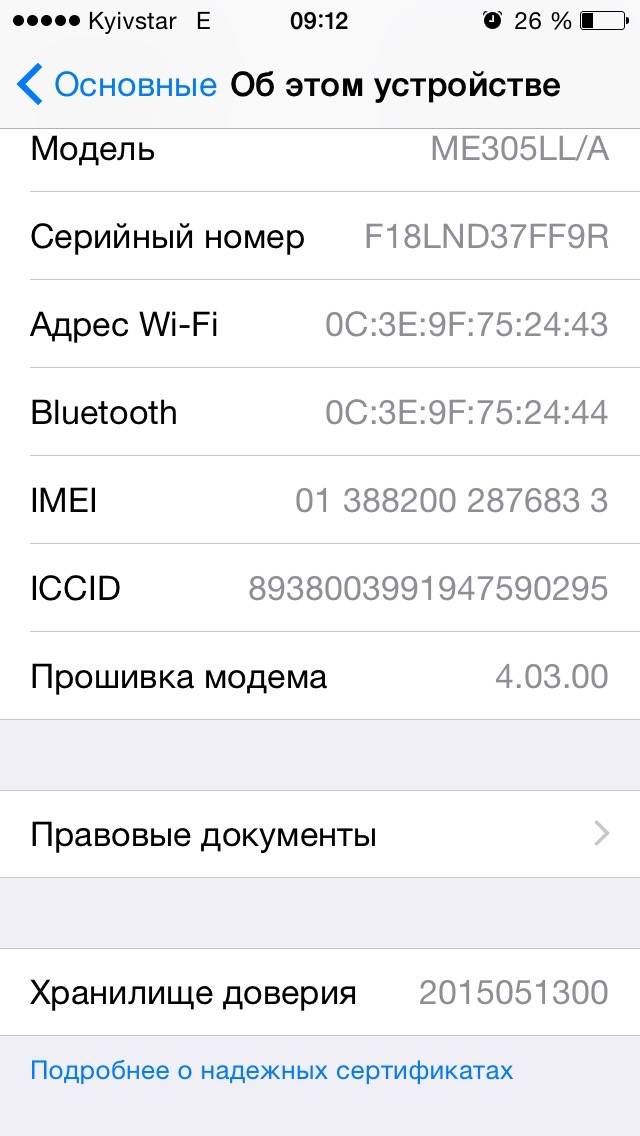 4. Перед вами откроется экран с указанием настроек iPhone (модель, серийный номер, версия iOS и т.д.)
