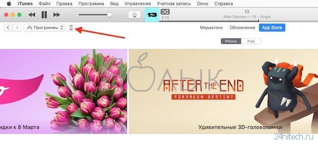 3. iTunes должен определить подключенный iPhone (если подделка, то iTunes просто проигнорирует), должна появиться иконка с изображением iPhone, нажмите на нее.