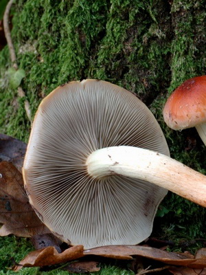 Пластинки: частые, узкоприросшие, светло-серого или жёлто-серого цвета. С возрастом цвет меняется на серо-оливковый, иногда с фиолетовым оттенком.