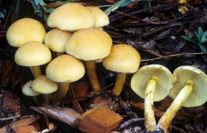 Эти ядовитые опята характеризуется ржаво-оливковыми плодовыми телами. На поверхности грибов можно заметить чешуйки, которые похожи на колер пережаренных кофейных зернышек. Мякоть имеет желтый окрас.