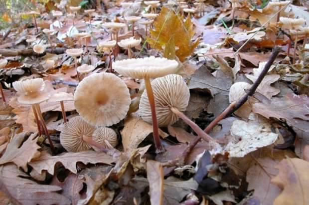 Весной в смешанных или лиственных лесах (доминирующие виды деревьев – осина или дуб) появляются грибы на тонкой ножке – опята весенние, из рода Негниючник. Эти опята растут на преющей листве и гниющих поваленных деревьях. Ножка тонкая, упругая, цвет шляпки сначала кирпичный, затем жёлто-бурый.