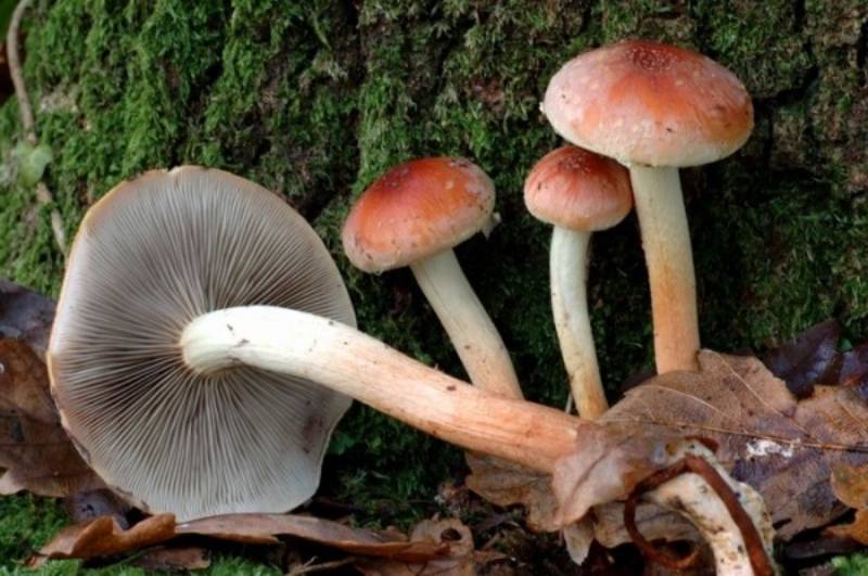 - Шляпки старых опят кажутся заплесневелыми из-за высыпающихся белых спор