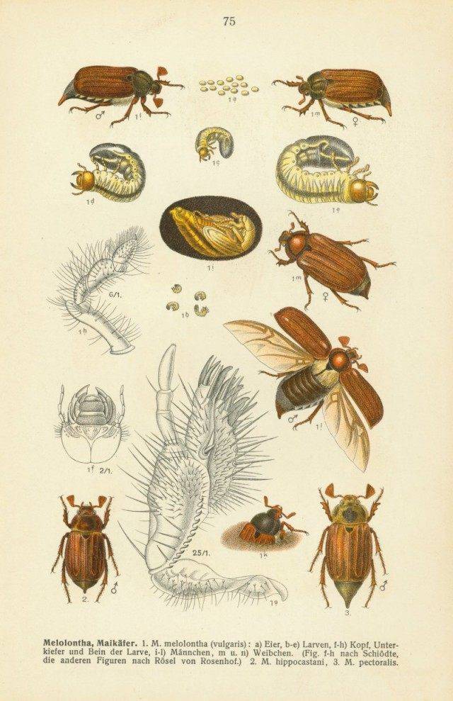 Цикл развития майского жука. Иллюстрация из II тома энциклопедии «Фауна Германии» Эдмунда Райтера. 1908 год