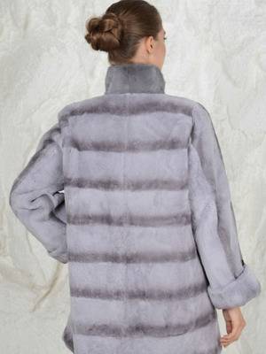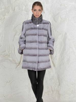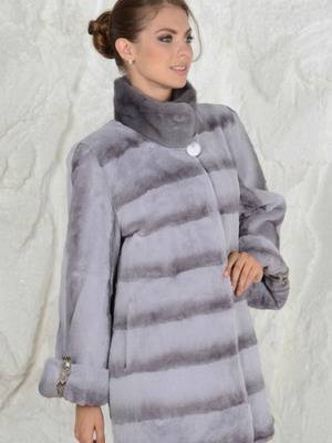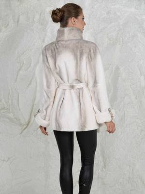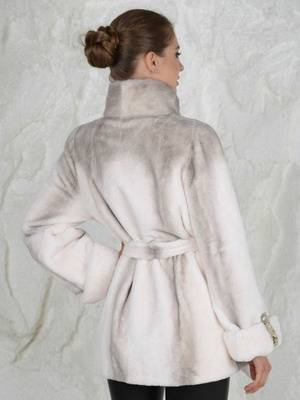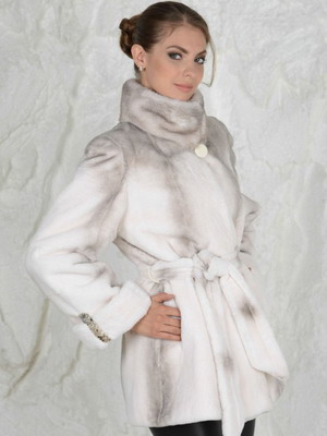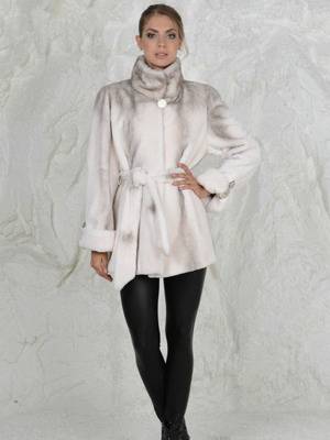 Это укороченная шубка А-силуэта, выполнена в дымчатом цвете, с едва заметным сиреневатым оттенком, придающим изделию благородства. Шубка такого фасона подойдет всем девушкам и женщинам без исключения, ведь она скрывает имеющиеся недостатки фигуры и выгодно подчеркивает ее достоинства.
