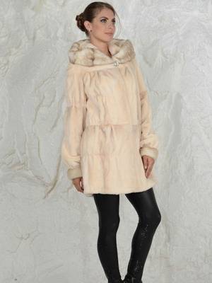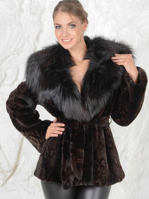 Модель является сочетанием двух видов меха – бобра и песца. Все изделие выполнено из бобрового меха, а воротник – из песца. Выбирая головной убор под такую шубку, стоит отдать предпочтение такой же роскошной песцовой шапке.