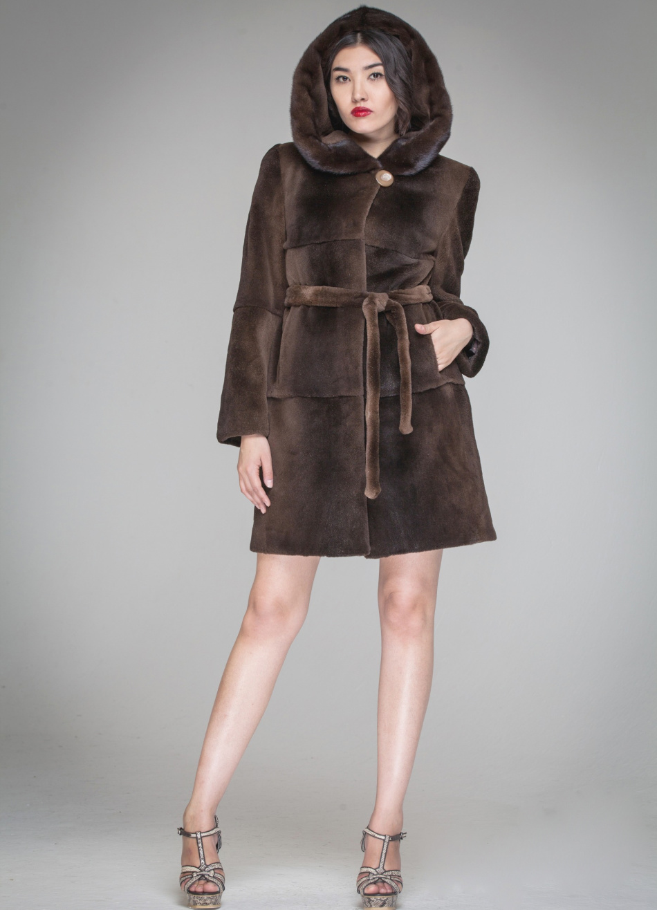 Здесь на фото шуба из стриженого бобра имеет красивый коричневый цвет, модель дополнена изящным воротником-стойкой, который придает изделию строгости: