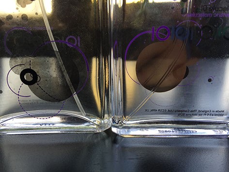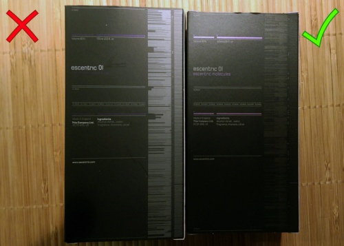 Ширина клеенки, складки и следы клея выдают это. На оригинальном парфюме (справа) швы идеально ровные.