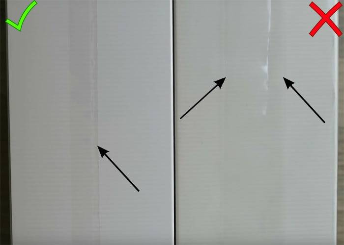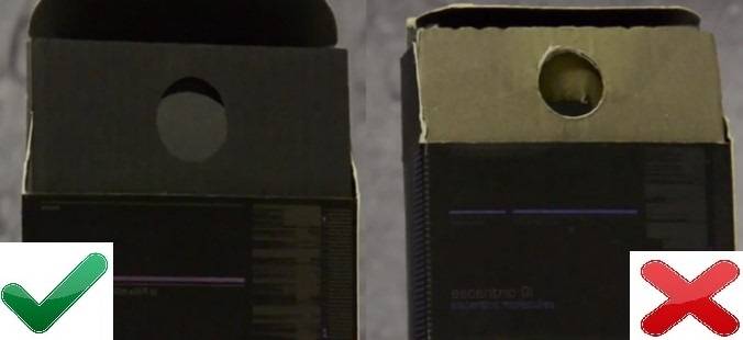Оригинальный продукт упакован в тонкую полиэтиленовую пленку, идеально сложенную по углам. Швы проклеены термическим способом. Некачественный продукт упакован в яркую цветную коробку из тонкого картона. Она выглядит неуверенной и хрупкой. У контрафактной продукции склеенная упаковка, а швы очень широкие.