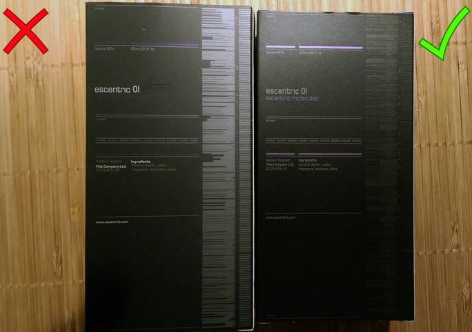 После этого стоит учесть описание производителя. Оно, как правило, наносится с левой стороны вверху. На оригинале присутствует фраза: «Made in England, This Company Ltd. ERIC 4RN, UK». При этом на фейке указана такая маркировка: «Escentric Molecules PO Box 66746, London, NW5 9GG, UK».