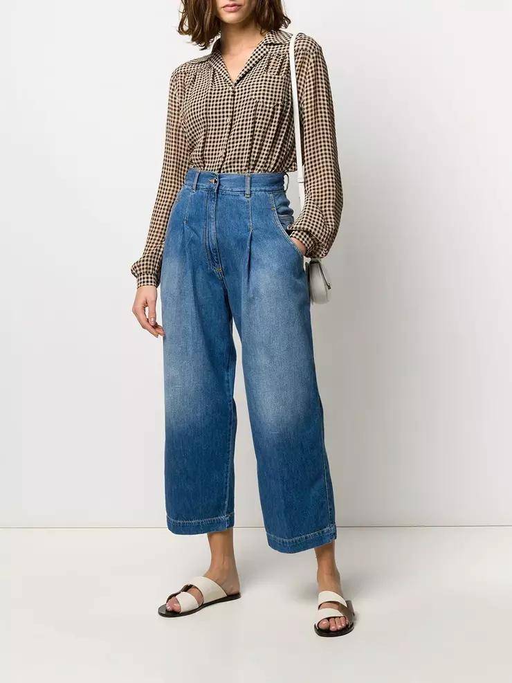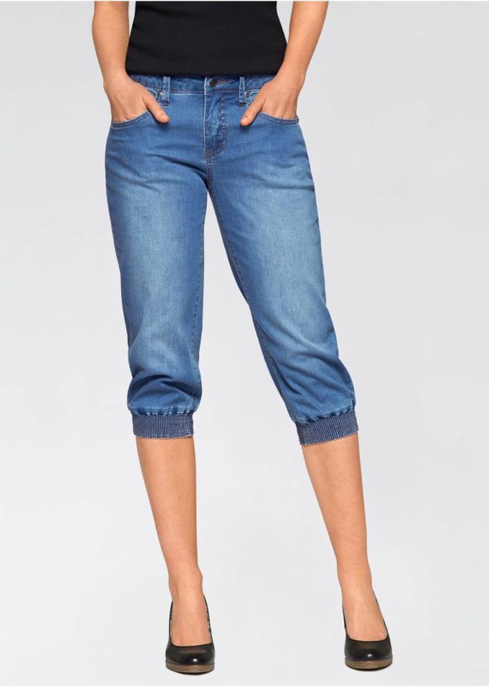 Это широкие укороченные брюки прямого кроя длиной до середины колена. Под коленом широкие раструбы собираются в плотные манжеты. Джинсовые бриджи обычно шьются из мягкого легкого денима и носятся в основном летом.