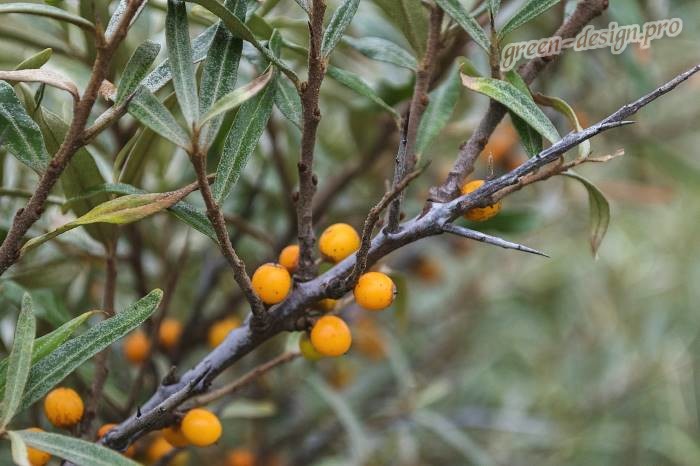 - Облепиха крушиновидная. Представляет собой невысокий колючий кустарник до 3 м. Двудомное растение, которое цветет в апреле или мае. Произрастает вдоль водоемов и в приусадебных садах. Плоды ярко-оранжевой окраски имеют горьковатый вкус.