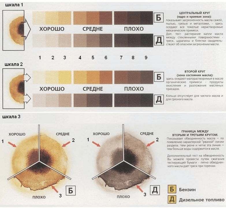 Пятно на фильтровальной бумаге можно сравнить с показаниями специальной таблицы «Шкала образцов капельной пробы». По результатам такого теста можно сделать следующие выводы: при оценке от 1 до 3 поводов для беспокойства нет. Оценка от 4 до 6 баллов считается средней. А при значении от 7 баллов необходима срочная замена масла.
