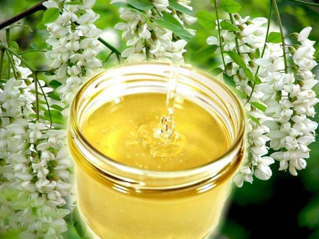 - Акациевый – прозрачный, светло-желтоватого оттенка, с жидкой консистенцией. За счет низкого содержания глюкозы полезен при сахарном диабете и гипертонии.