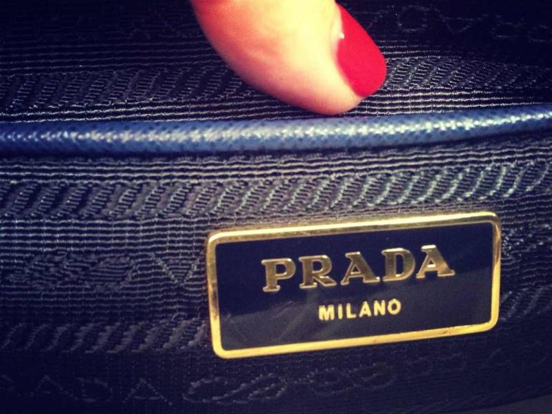 Логотип, который находится внутри сумочки, обладает прямоугольной формой. Его делают металлическим и покрывают эмалью. Оттенок совпадает с базовым цветом сумки Прада. Внутри нашивка обладает прямоугольной формой, а края таблички – закругленной. Главным отличием фальшивки считается отсутствие таблички в сумке.