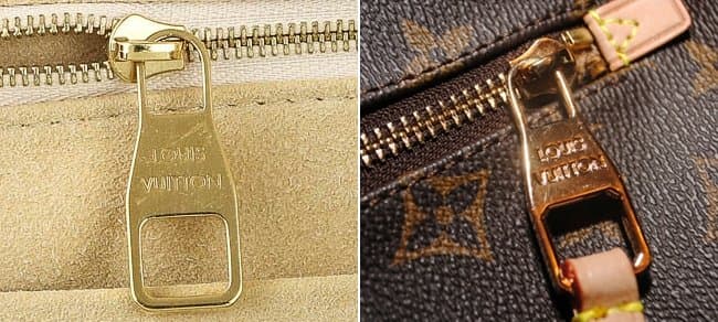 Посмотри на фото: слева — настоящая молния сумки Louis Vuitton, справа — подделка. Кстати, имей в виду, что в процессе носки вся фурнитура бренда тускнеет одинаково. На ней появляется своеобразный зеленый пигмент.