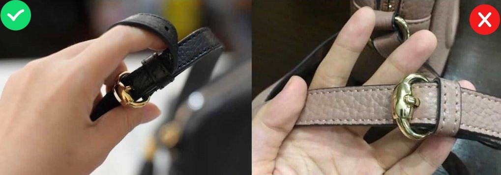 Тканевая часть обычно украшается фирменной монограммой GG. Бренд не придерживается ровной состыковки ткани, поэтому обрезанный логотип не является признаком подделки.