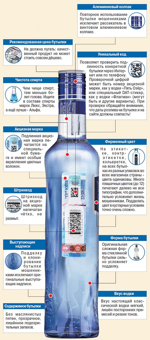 Существуют признаки, по которым можно определить оригинальность водки еще до ее покупки, просто путем осмотра бутылки: