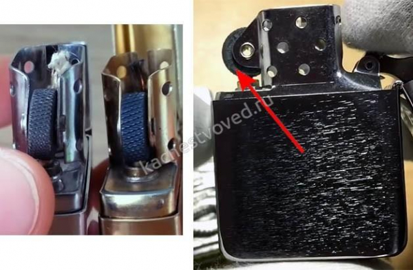 Не менее важно внимательно рассмотреть посадочное место под кремень. В оригинальной зажигалке Zippo площадка под кремень с инсертом скрепляется с помощью эпоксидного клея